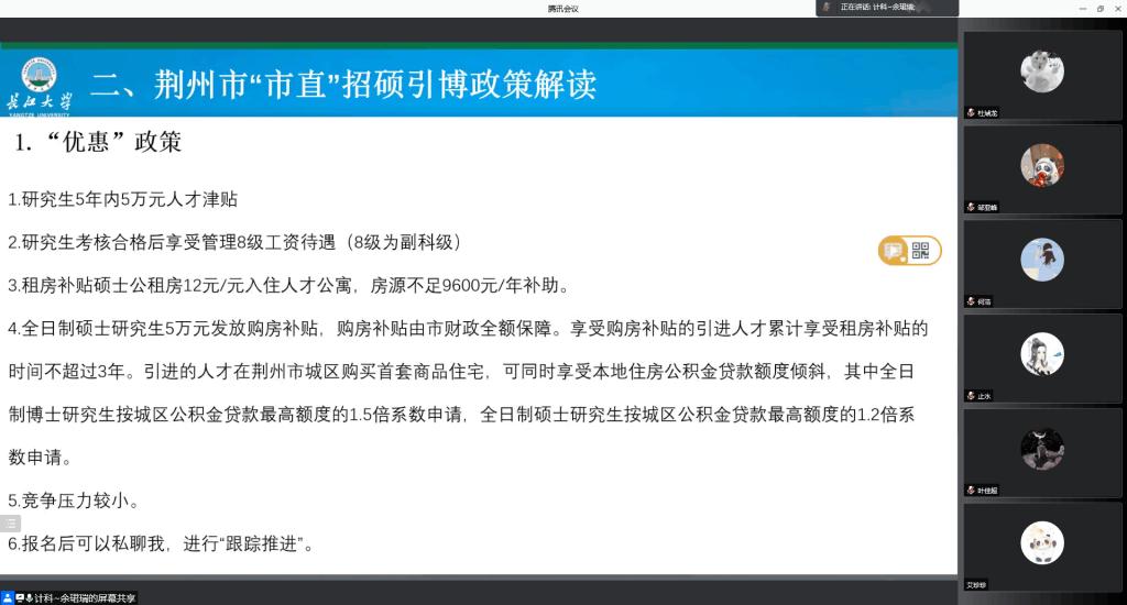 (通訊員 余珺瑞)我院于2月25日晚上7點在騰訊會議上召開19級研究生荊州市“招碩引博”政策解讀及春招動員活動。本次會議由就業(yè)輔導(dǎo)員余珺瑞老師主持,學(xué)院副院長宋文廣、黨委副書記顏學(xué)俊、及全體19級研究生參加了本次活動。