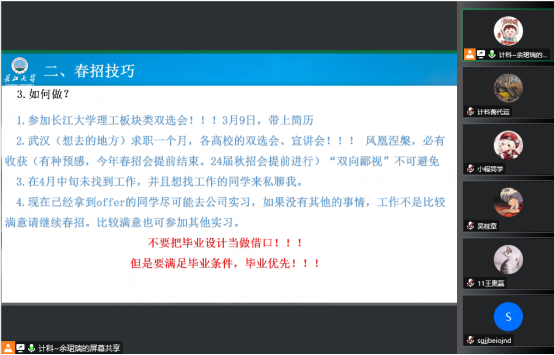 本次會(huì)議就業(yè)輔導(dǎo)員余珺瑞主要從春招形勢和春招技巧兩個(gè)方面對23屆畢業(yè)生進(jìn)行了春招指導(dǎo),并動(dòng)員23屆畢業(yè)積極求職把握好應(yīng)屆生身份。黨委副書記顏學(xué)俊對23屆畢業(yè)生提出了“先就業(yè),再擇業(yè)”的就業(yè)觀念,希望大家能夠把握好春招機(jī)會(huì),獲得一個(gè)相對滿意的工作后再尋求更滿意的工作會(huì)后,23屆24屆畢業(yè)生針對應(yīng)屆生身份、如何獲取高薪資、如何修改簡歷等方面與余老師進(jìn)行了熱烈的討論。
