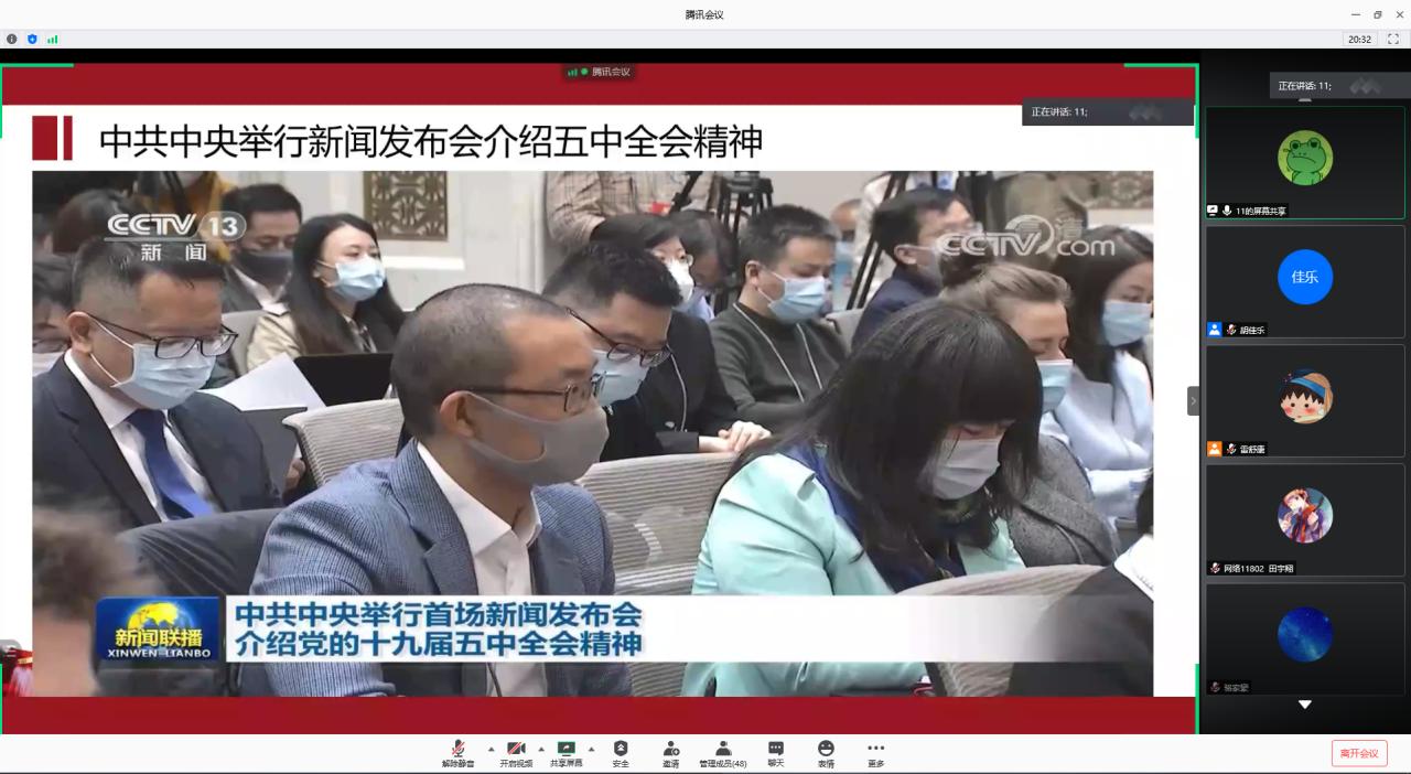 此次團會是采用線上線下結(jié)合方式,各支部團副在線上召開班團會,團會負(fù)責(zé)人宣讀本次團會的相關(guān)事務(wù)和宣揚主題精神。給同學(xué)們講解黨的十九屆五中全會相關(guān)內(nèi)容傳達其重要精神;隨后組織同學(xué)們觀看習(xí)近平在紀(jì)念中國人民志愿軍抗美援朝出國作戰(zhàn)70周年大會上的講話視頻;組織同學(xué)們觀看習(xí)近平總書記給各大高校回信的視頻及其原稿,并以4人小組形式就習(xí)近平總書記給高校師生的信件精神與致敬抗美援朝·爭做時代新人展開討論,每個小組推選出代表出來發(fā)言。最后團會負(fù)責(zé)人與同學(xué)們一起核對青年大學(xué)習(xí)完成情況,并進行總結(jié)。
