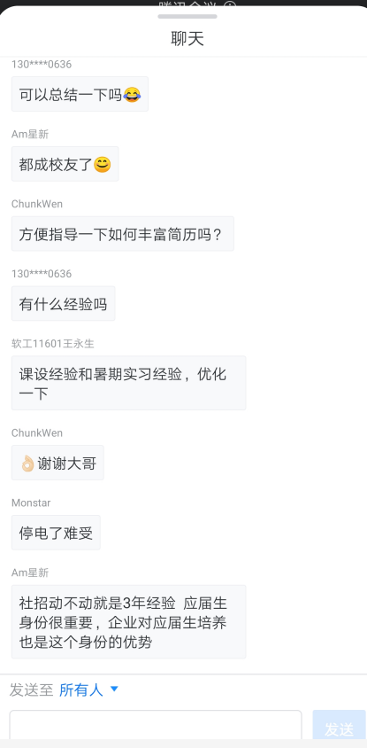 隨后,王進宇吳凡王永生三名同學先后分享了自己的求職過程和在求職過程中總結(jié)的一些經(jīng)驗。王進宇同學目前已成功簽約富士康下的鴻富錦精密工業(yè)(深圳)有限公司,如何寫簡歷,如何投簡歷以及如何準備面試等三個方面進行了細致的講解,最后著重強調(diào)了校招的重要性吳凡同學已成功簽約深圳市吉祥騰達科技有限公司主要從校園招聘求職的角度,圍繞“如何搜集和篩選校園招聘信息”、“校園招聘的基本流程”、“簽約的注意事項”等方面進行講解。王永生同學成功簽約北京華宇興泰科技有限公司,他主要從我是誰,要給自己一個比較準確的定位;我從哪里來,對于想要就業(yè)的同學,多和學長學姐交流交流;我到哪里去,先選擇一個自己喜歡的城市,再選擇一個比較好的公司等方面進行相應(yīng)的講解。最后,顏書記對本次就業(yè)分享會進行總結(jié)他希望2020屆未找到工作的同學樹立先就業(yè)、再擇業(yè)的觀念,更要充分利用自己應(yīng)屆畢業(yè)生的身份優(yōu)勢,提醒學生千萬不要錯過企業(yè)對2020屆畢業(yè)生的校招,否則將會面臨更大的就業(yè)壓力。同時,他也希望2021屆的準畢業(yè)生們早日做好求職準備,在明年畢業(yè)前都能找到相對滿意的工作。