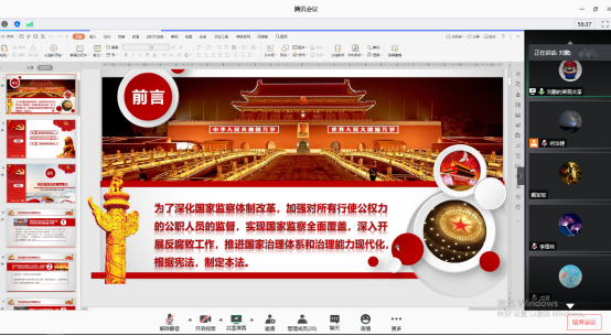 此次團(tuán)會(huì)以線上形式,組織同學(xué)們觀看《學(xué)習(xí)監(jiān)察法,爭(zhēng)做廉潔人》相關(guān)視頻,并以“監(jiān)察法”相關(guān)內(nèi)容展開(kāi)研討,加深同學(xué)們對(duì)《監(jiān)察法》的認(rèn)識(shí),強(qiáng)化同學(xué)們的廉潔思想意識(shí);最后主持人向同學(xué)們推送監(jiān)察法知識(shí)測(cè)試,并督促同學(xué)們完成。會(huì)議過(guò)程中同學(xué)們積極配合,踴躍發(fā)表自己的看法。