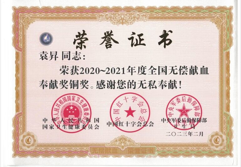 2023年,國(guó)家衛(wèi)生健康委、中國(guó)紅十字會(huì)總會(huì)、中央軍委后勤保障部衛(wèi)生局頒布《關(guān)于表彰2020-2021年度全國(guó)無(wú)償獻(xiàn)血表彰獎(jiǎng)勵(lì)獲獎(jiǎng)?wù)叩臎Q定》,我院2021級(jí)學(xué)生袁昇榮獲全國(guó)“無(wú)償獻(xiàn)血奉獻(xiàn)獎(jiǎng)銅獎(jiǎng)”。