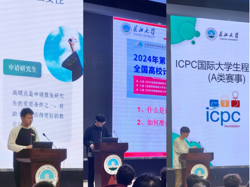 接著,老生代表們依次發(fā)言。計科12104班王鑫銳介紹了本科生涯規(guī)劃,特別強調(diào)了績點的重要性,為新生們樹立了努力學(xué)習(xí)的目標。2023級研究生趙怡帆詳細介紹了計算機能力挑戰(zhàn)賽的準備方法,讓新生們對賽事有了更清晰的認識。計科12305班紀方嘉則分享了程序設(shè)計競賽的相關(guān)經(jīng)驗,激勵新生們積極參與競賽,提升自己的專業(yè)技能。